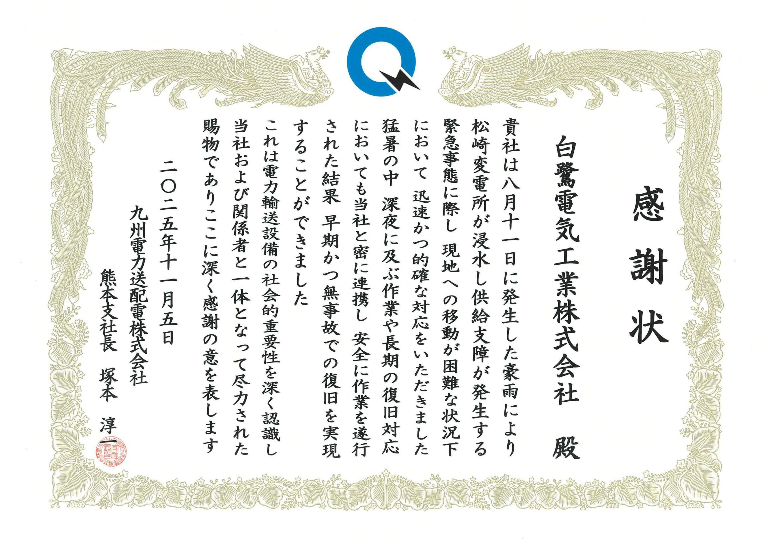 11月5日、九州電力送配電株式会社様より、感謝状を受賞しました。 この表彰は、令和7年8月豪雨により松崎変電所で供給支障が生じた際、移動が困難な状況下においても迅速かつ安全に対応し、早期復旧に貢献したことを評価いただいたものです。