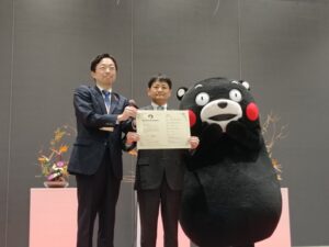 また、会場では新制度である「くまもと県産木材炭素貯蔵量認証制度」の認証交付式も行われ、くまモンも参加するなど、和やかな雰囲気の式典となりました。