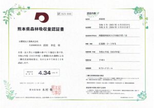 この制度は、森林整備活動によって吸収された二酸化炭素量を熊本県が認証するものです。弊社は制度創設当初から15回連続で認証を受けており、 4.34t-CO2/年が認証されました。