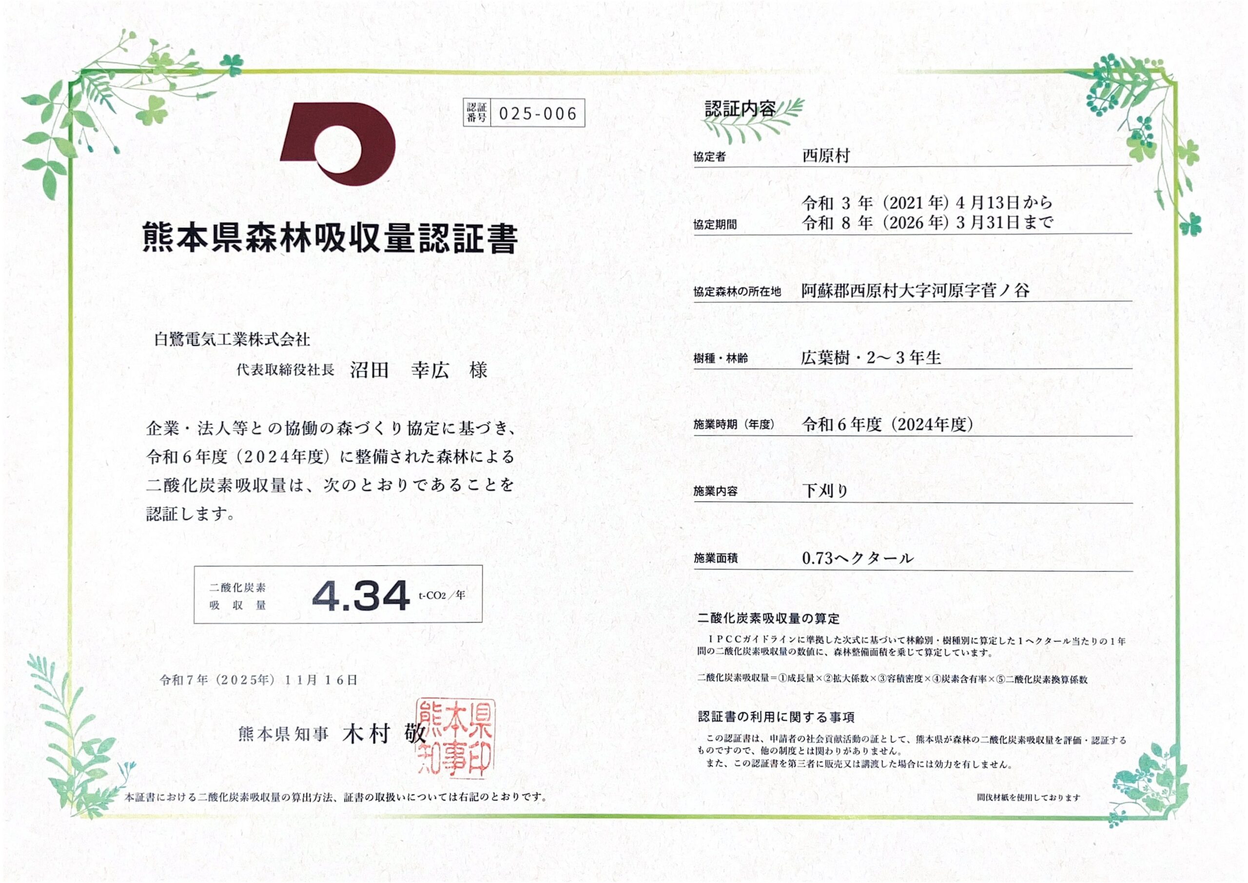 この制度は、森林整備活動によって吸収された二酸化炭素量を熊本県が認証するものです。弊社は制度創設当初から15回連続で認証を受けており、 4.34t-CO2/年が認証されました。
