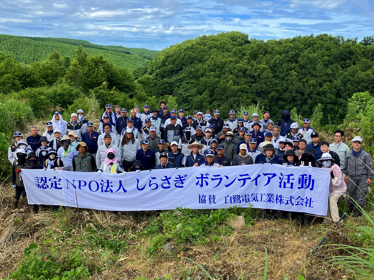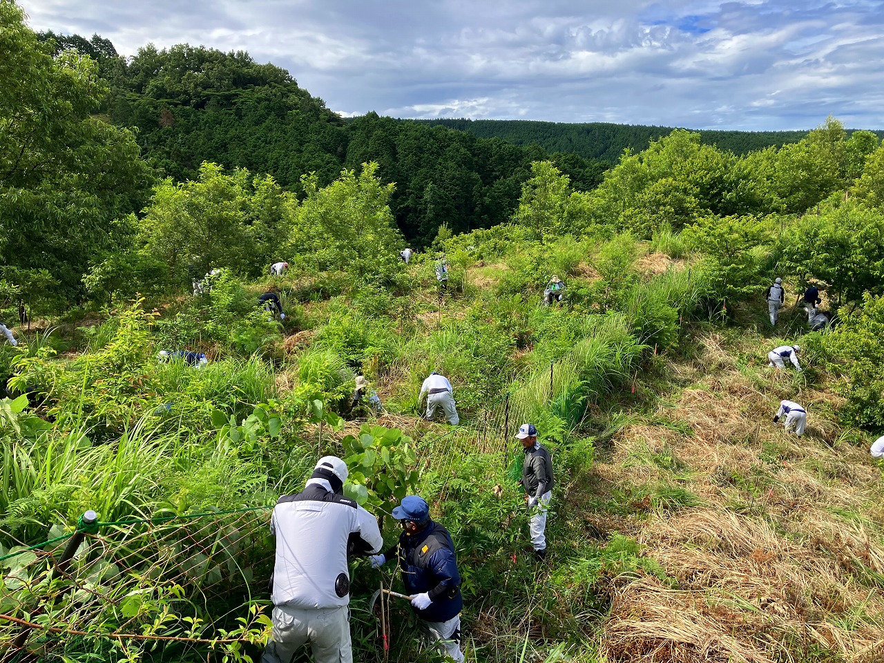 当日はよく晴れた夏空のもと、厳しい暑さが続く中での作業となりましたが、熱中症対策を万全に講じたうえで、社員とそのご家族、そして協力会社やお取引先の皆さまにもご参加いただき、総勢90名が力を合わせて草刈りに取り組みました。