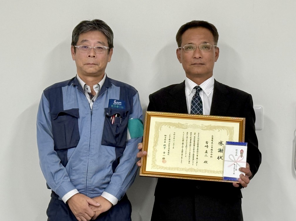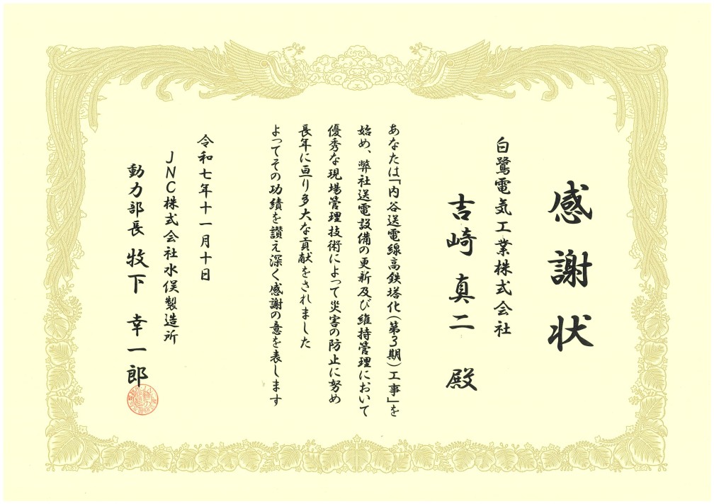 新着情報 News Home 新着情報 お知らせ JNC株式会社 水俣製造所 動力部より感謝状受賞 JNC株式会社 水俣製造所 動力部より感謝状受賞 2025.12.25 お知らせ 11月10日、JNC株式会社 水俣製造所 動力部長 牧下様より感謝状を受賞しました。 本感謝状は、「内谷送電線高鉄塔化(第3期)工事」をはじめとする送電設備の更新および維持管理業務において、 優秀な現場管理技術により災害防止に努め、長年にわたり多大な貢献をしてきたことに対して贈られたものです。 日頃より、安全を最優先とした現場管理と確実な業務遂行に取り組んできた点が評価されました。 今後も送電設備の維持管理を通じて、地域の皆さまの安心・安全な暮らしを支えてまいります。 前の記事へ 記事一覧へ 次の記事へ 前の記事へ 次の記事へ 記事一覧へ