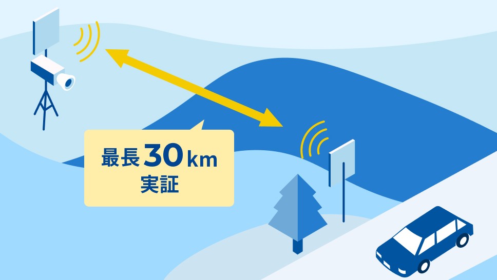 最大適用距離30km、携帯電話が繋がらない場所やインターネット回線が契約ができない中山間地域に有用です。中山間地域で活用するDXシステムのWi-Fiエリアを構築します。